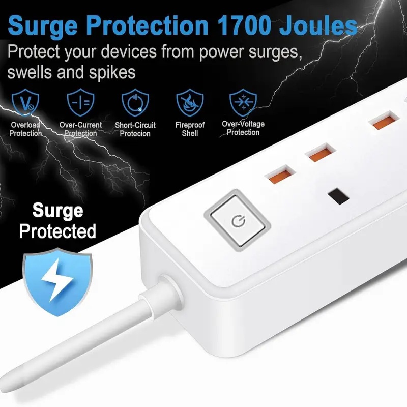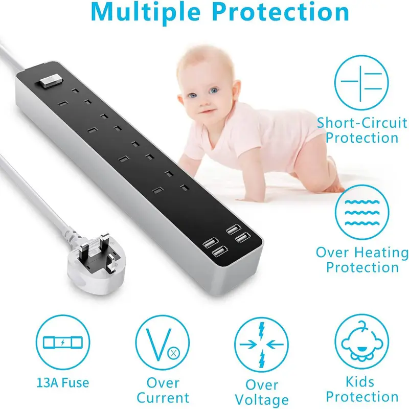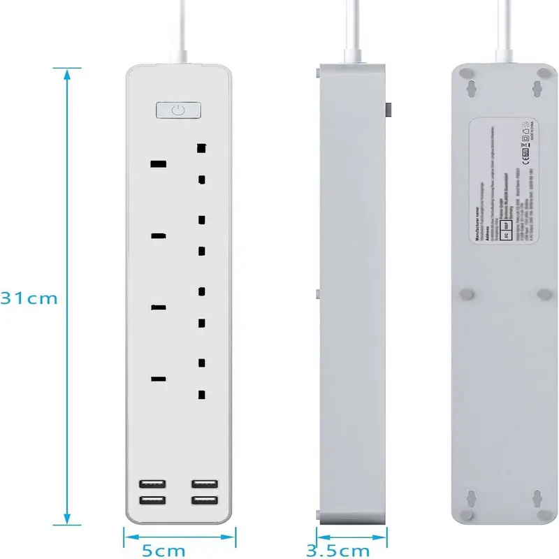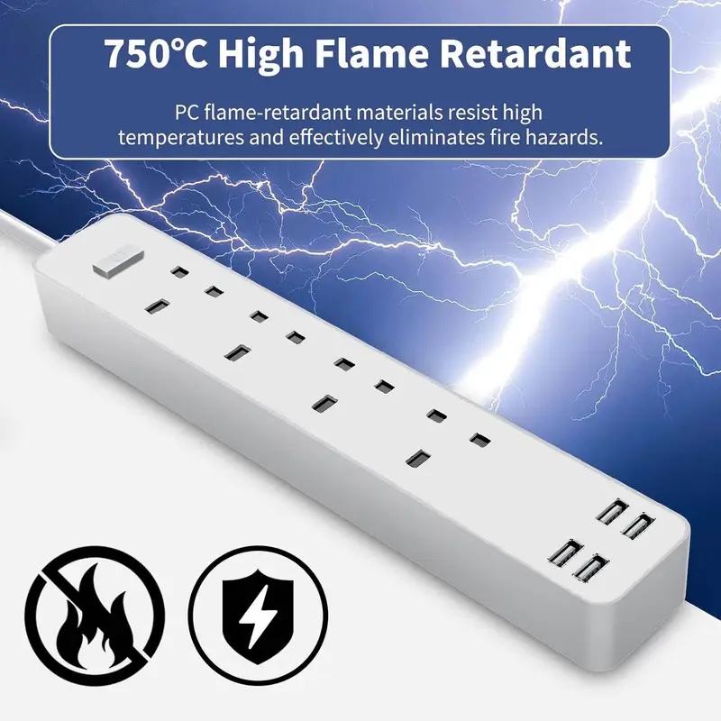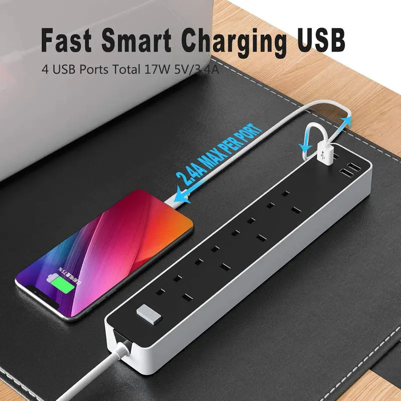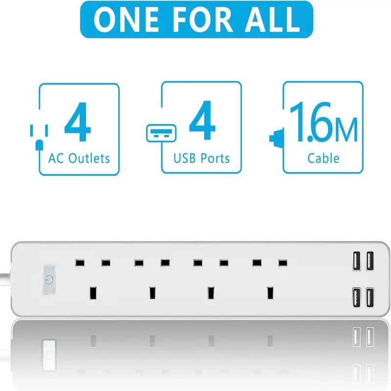 4-Socket Extension Lead with 4 USB Ports, 3.4A Fast Charging, 13A 3120W, 1.6m Cord, Fireproof PC & ABS, UK